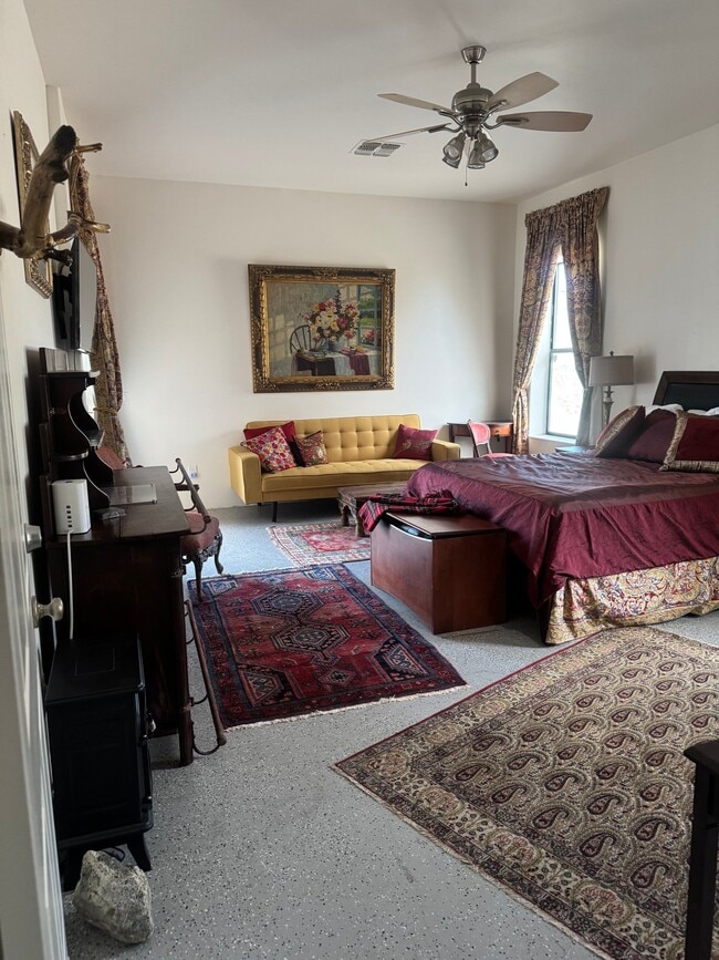 Has independent entrance is located in 5 acres ranch. It has a kitchenette with dishes utensils, refrigerator, microwave, toaster, coffee maker and boiler. The bathroom has jacuzzi tub, shower. The walking... closet has ample shelves and space for storage. The room is furnished with queen size bed, tv, desk, pull-up couch,…and equipped with central heat and air conditioner. The private entrance is from covered patio that is furnished by table and chairs.