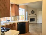 Enjoy a... bright open floor plan with vaulted ceilings, travertine flooring, crown molding, and a cozy gas fireplace. Recent updates include new exterior paint, two new exterior sliding doors, a new ceiling fan and kitchen lighting, a newer GE range oven and microwave, refinished bathroom cabinets, and new window coverings throughout.