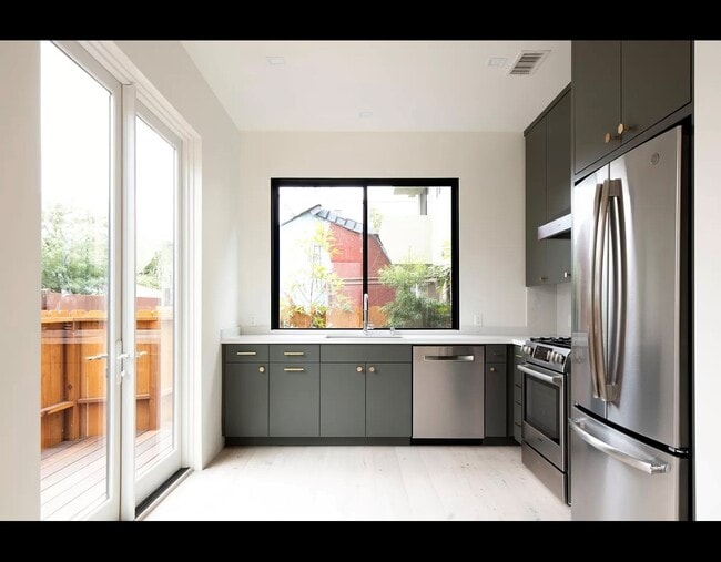 impeccable attention to detail, this unit seamlessly integrates the electric Venice vibe with contemporary finishes throughout.... The kitchen features custom cabinetry, Bosch range/oven, Caesarstone counters, and beautiful oversized window that opens out to the wrap-around deck. Primary bedroom on the 2nd floor has two closets w/ample storage, and en suite bathroom w/intricate encaustic tile flooring, dual sink vanity and walk-in shower. The top floor leads to an expansive rooftop deck w/breathtaking mountain and city views. The unit is complete w/central A/C, recessed lighting, engineered oak wood floors, in-unit laundry and outdoor shower.